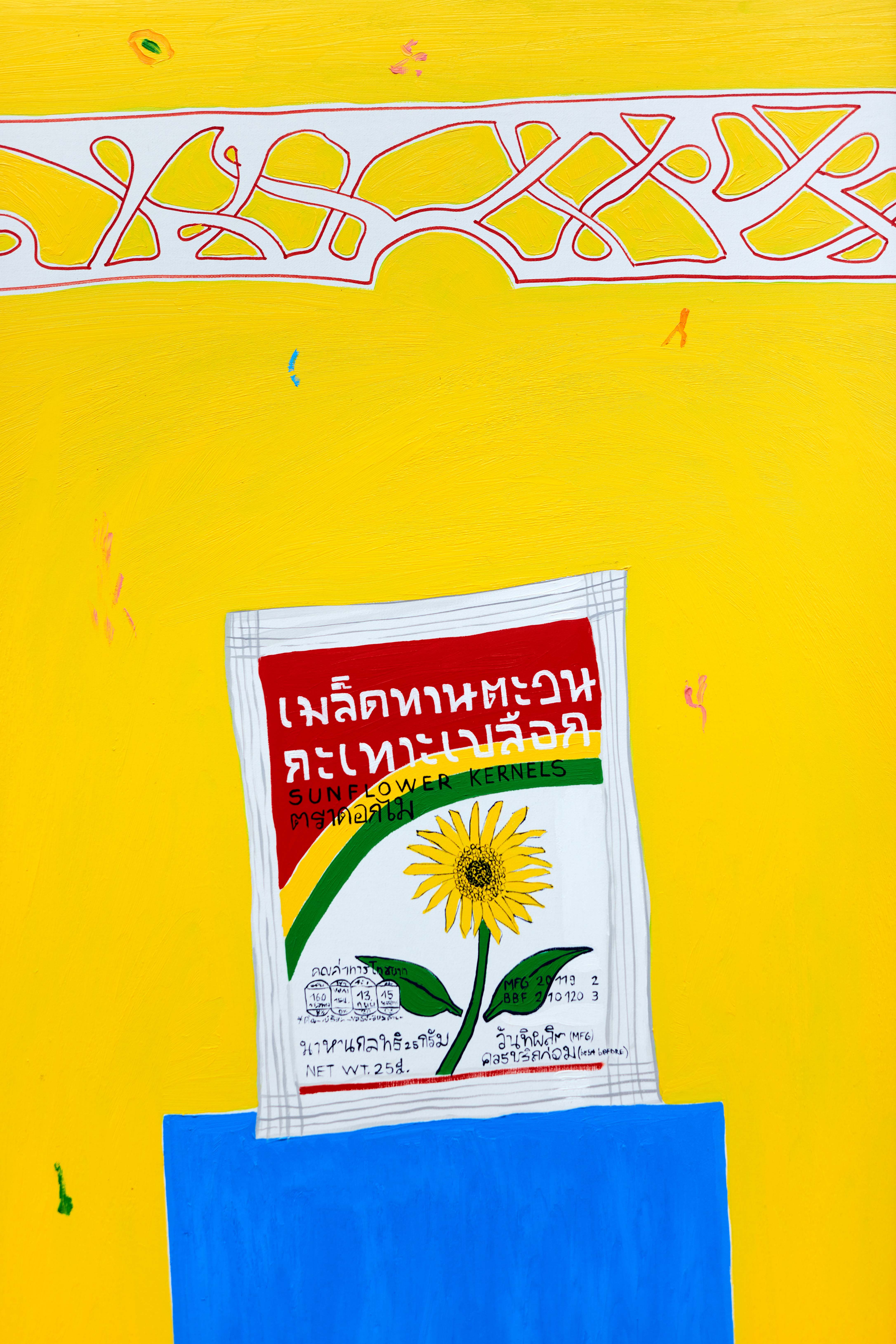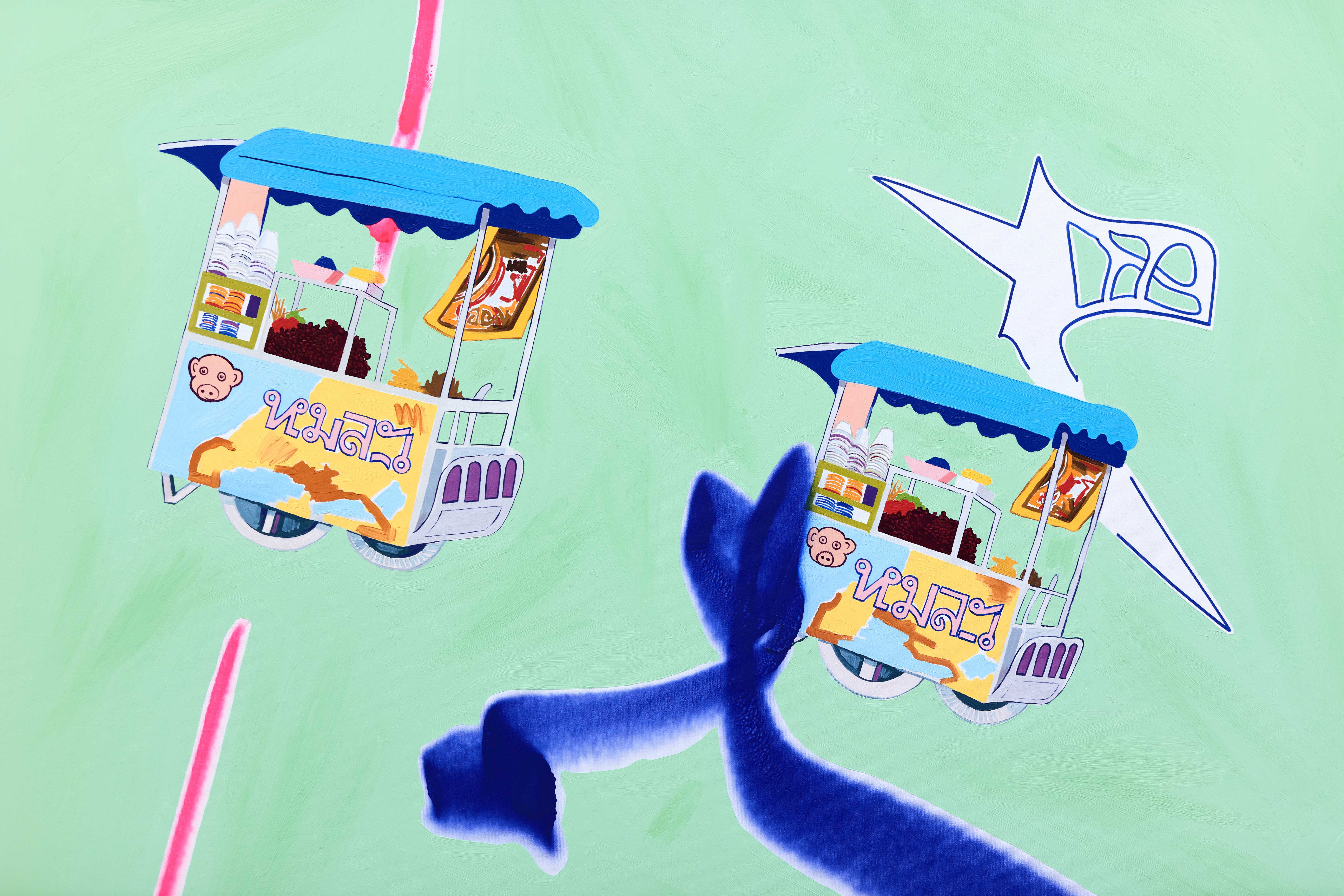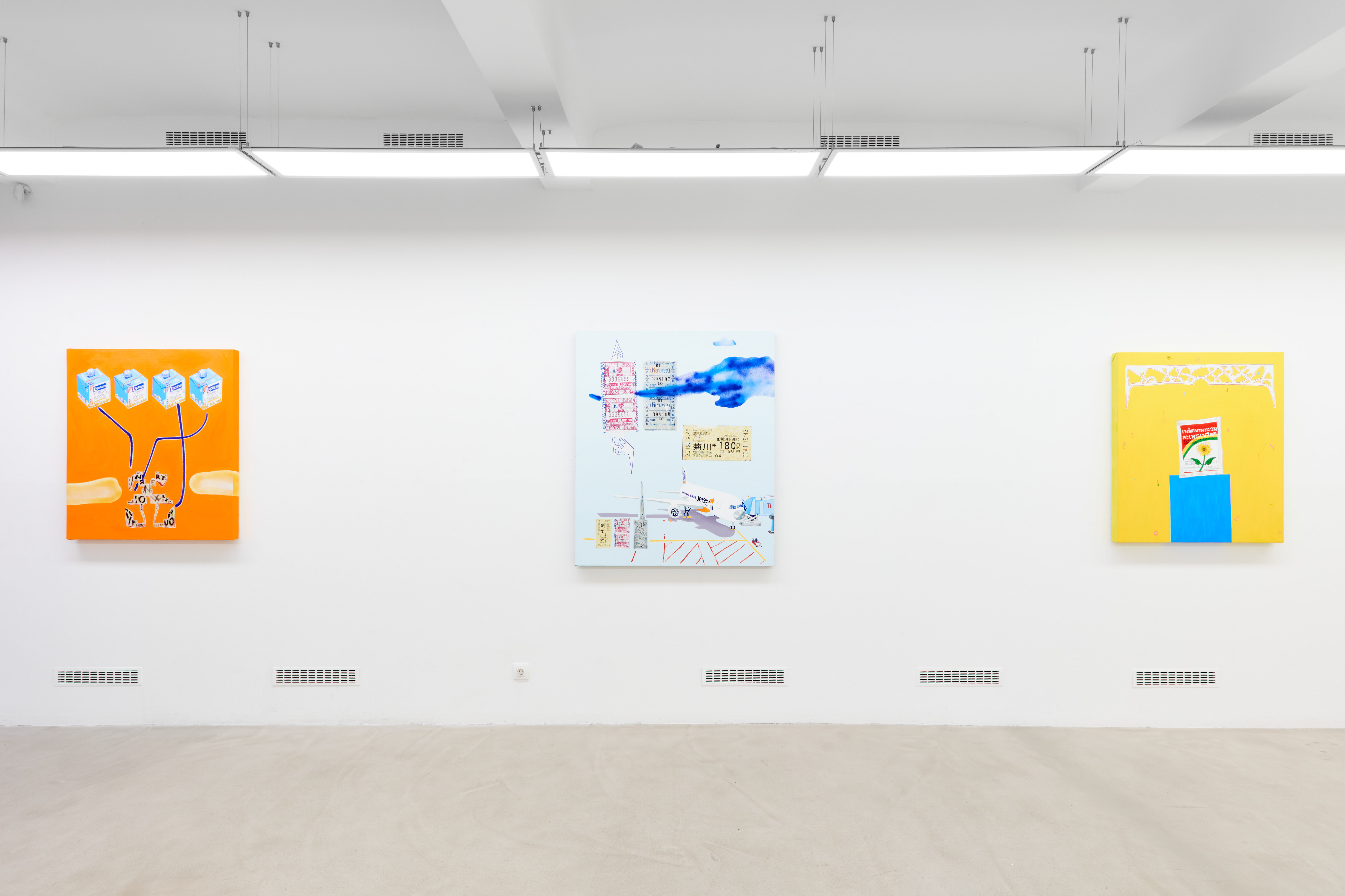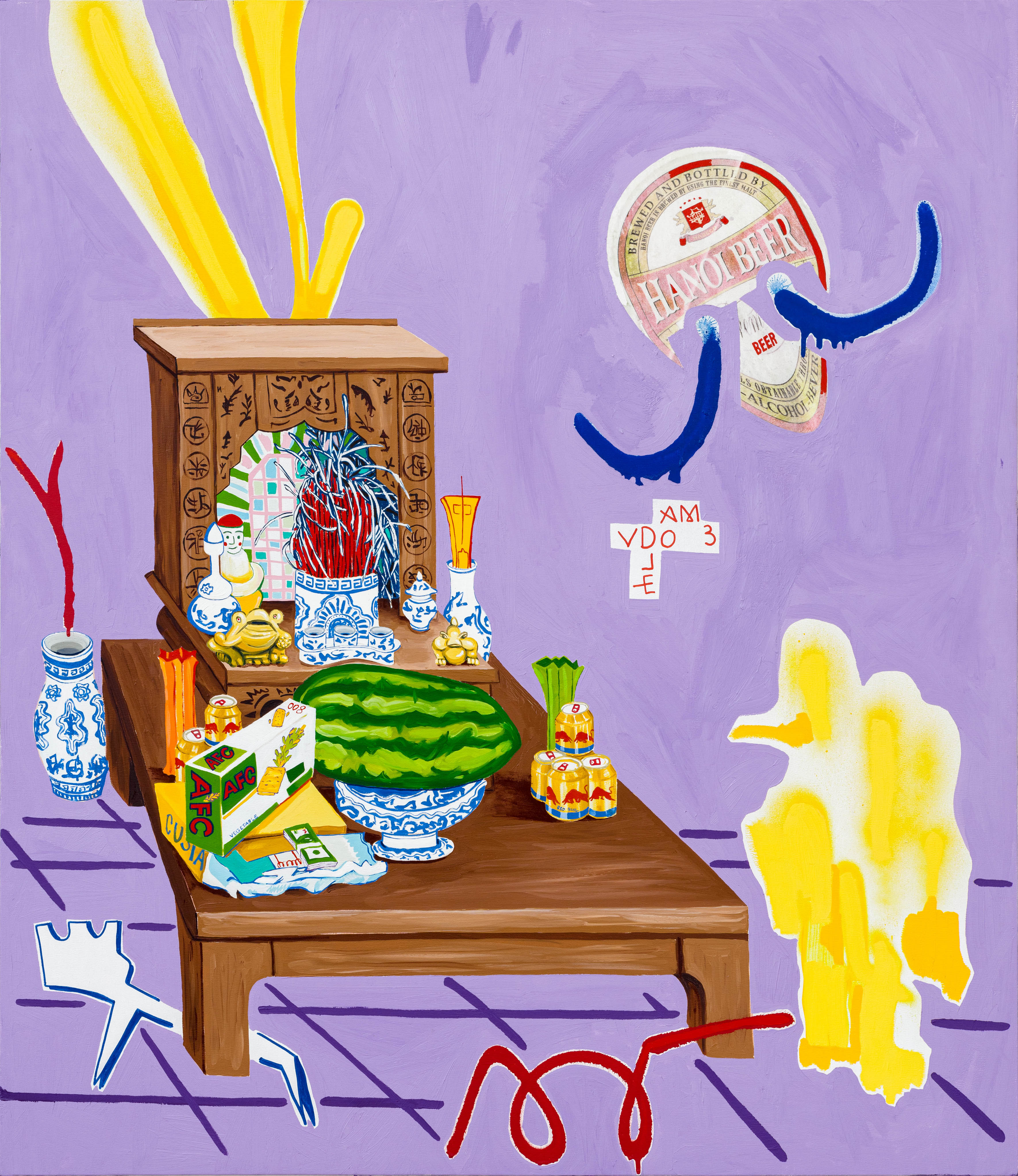 Through the artworks they created together, the exhibition of Dániel Bencs and Máté Bencs presents their journeys where they accumulated a rich set of motifs. The magical atmosphere of diverse regions is reflected in their artworks differently, but at the same time they also outline a mutual direction, a meeting point where their observations unite. The purpose of this exhibition is to condense the different impressions of the two brothers into pictures, thus revealing the similarities and differences between the interpretation of the same experience from two points of view. Their paintings deal with the relationship of religion and mass culture, the merging of the two, which was inspired by the commercial products displayed in Asian home sanctuaries. Red Bull energy drinks presented as offerings to the Buddha emanate a special sacred-pop atmosphere, by which we can witness the penetration of a product into a higher spiritual realm, building a bridge between two seemingly distant worlds. Andy Warhol's statement, that it is fantastic that the poorest person cools himself with the same Coca-Cola as the president, in this case manifests in the consumption of the same energy drink as the Buddha. Nowadays, we build the shrine of our own private mythology from the fragments of different ideologies in the same way that we choose products from the shelves of the stores, so a mix of thoughts from faraway parts of the world end up next to each other on the checkout line.