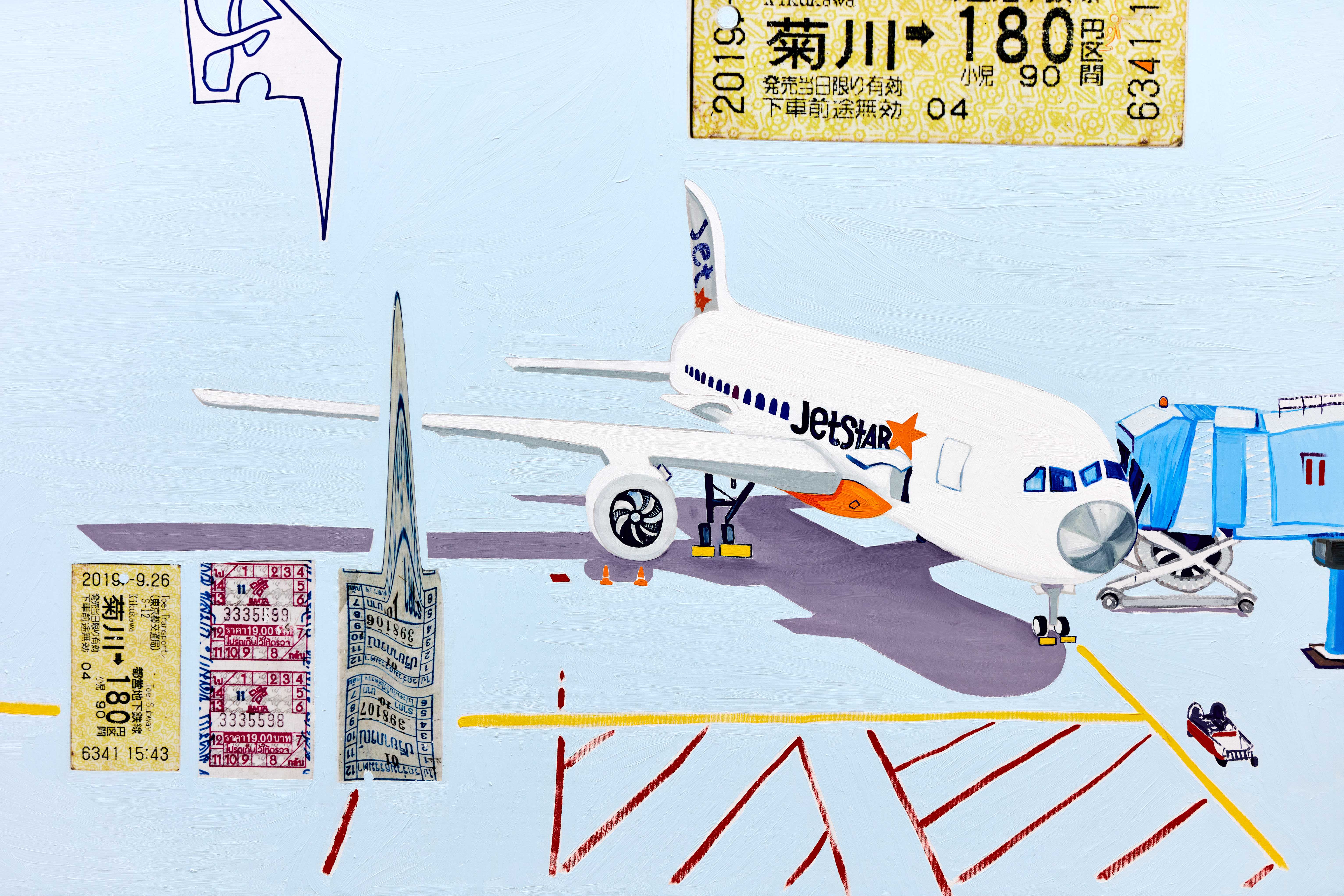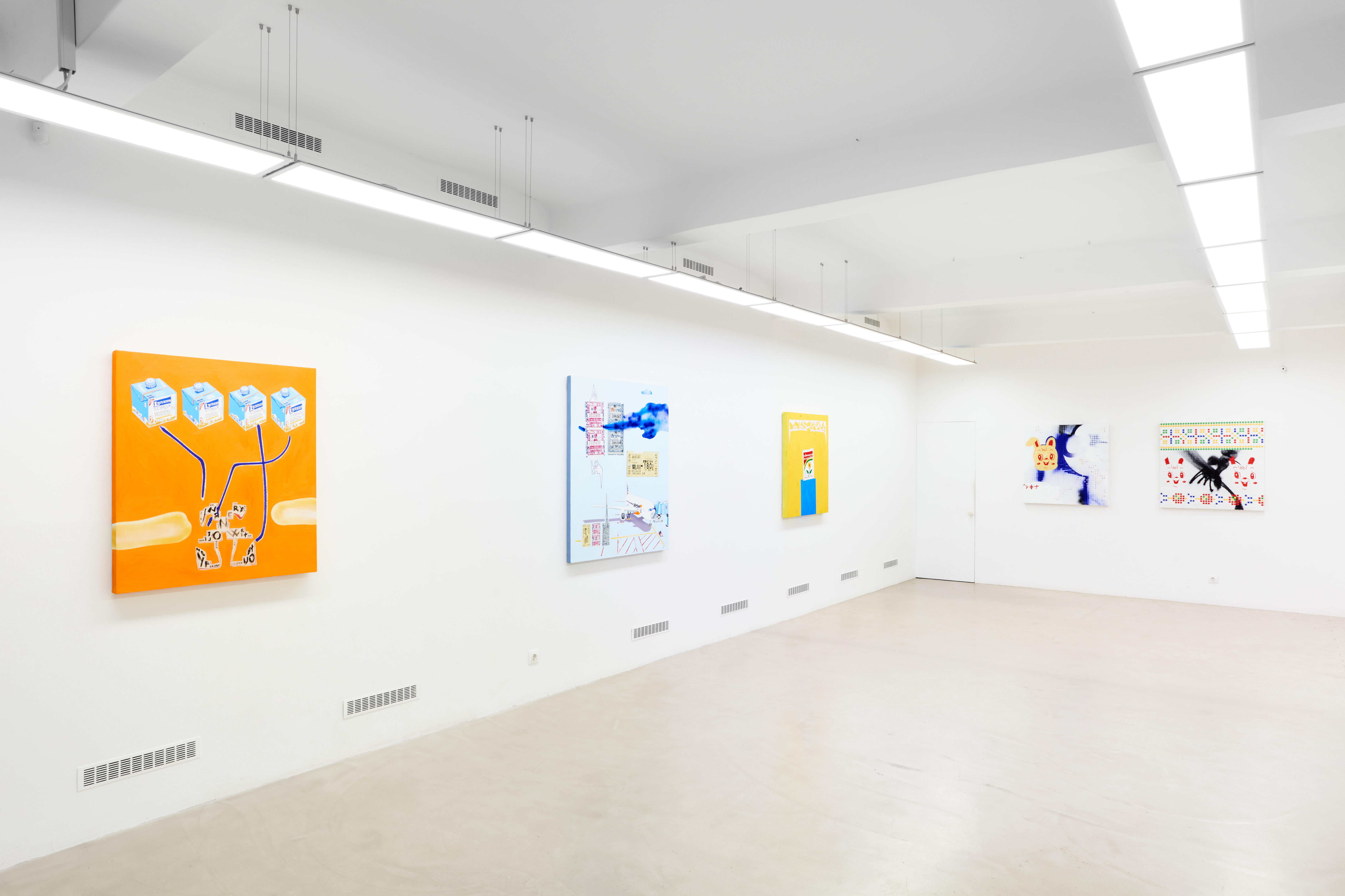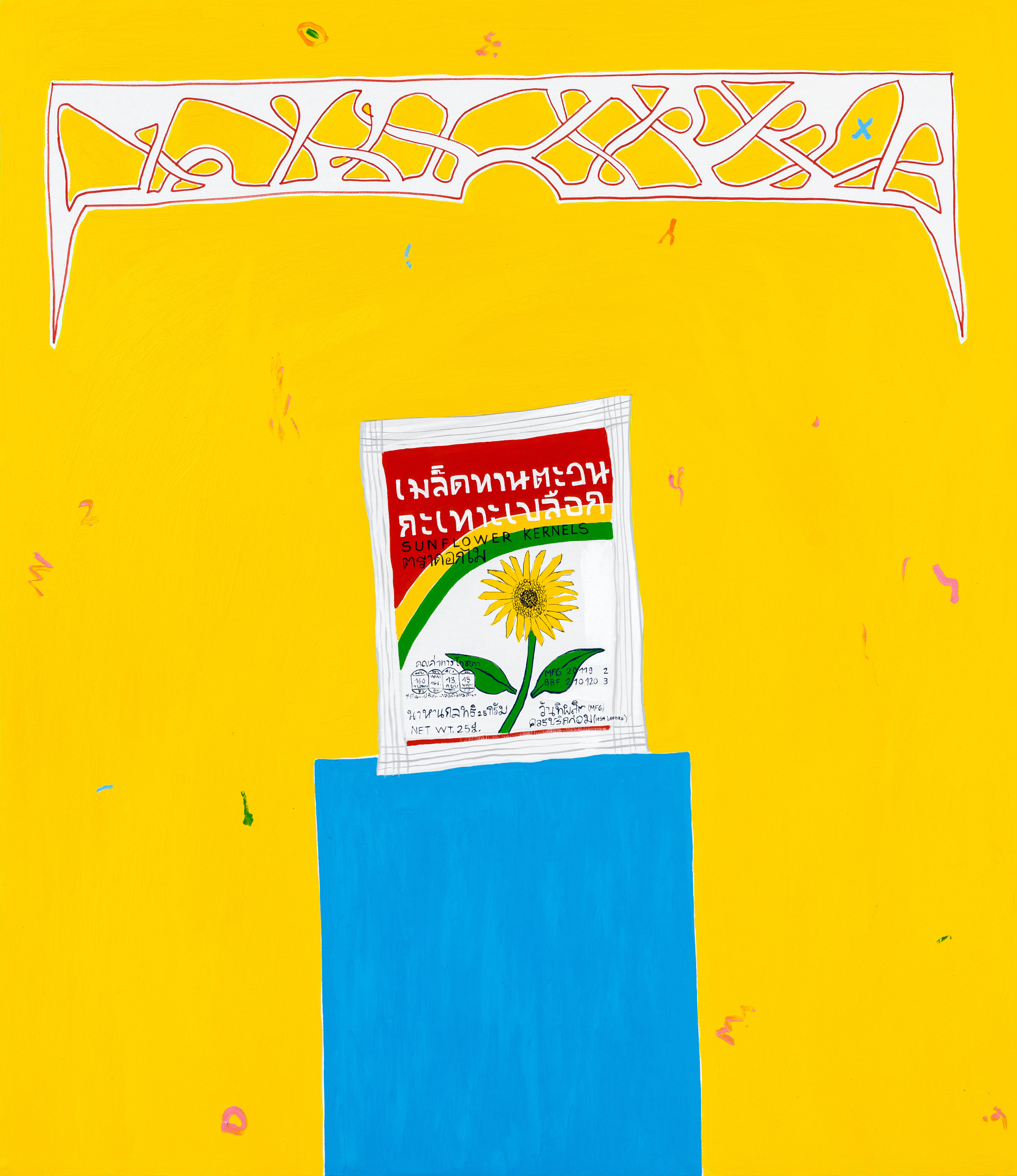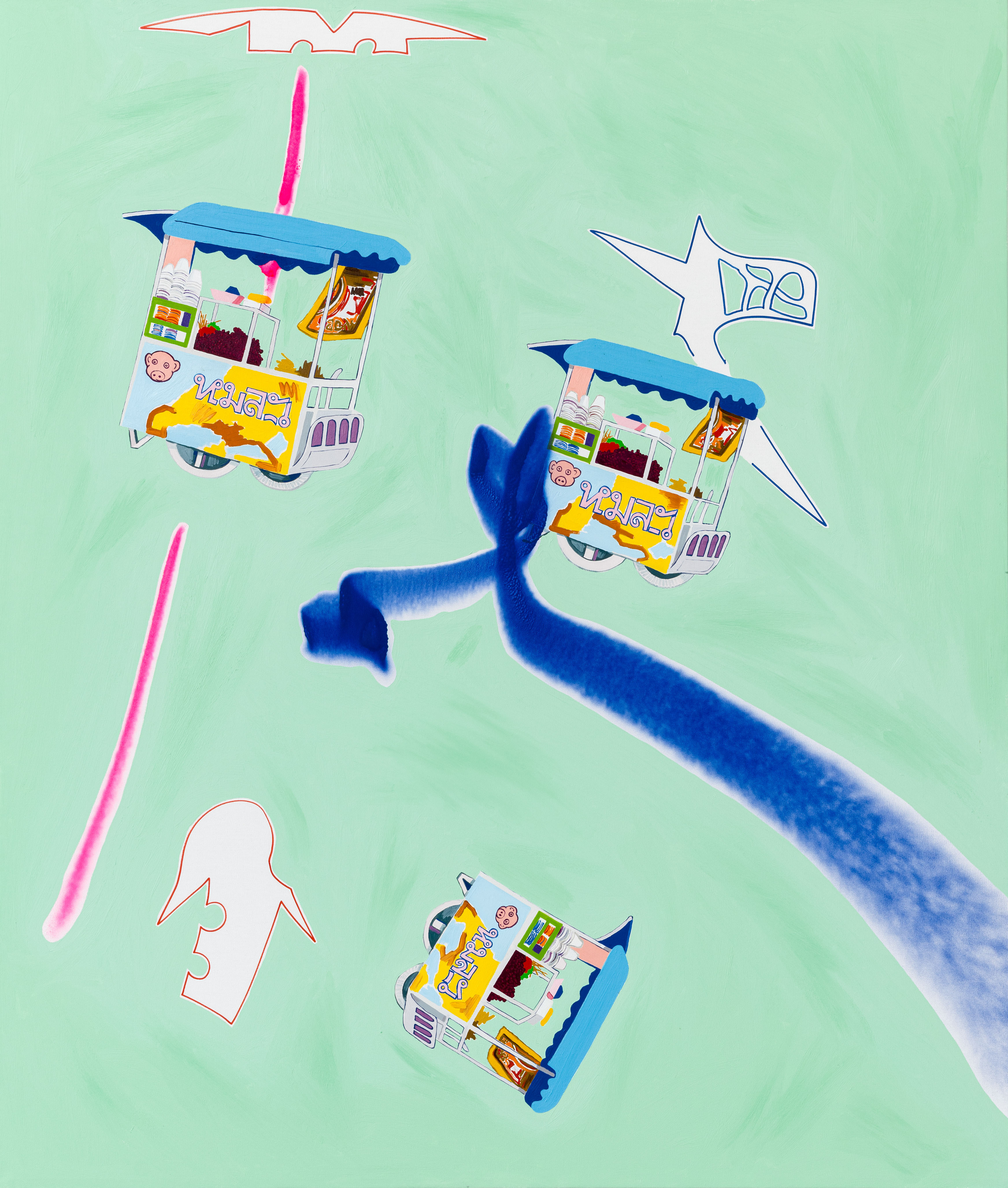 Through the artworks they created together, the exhibition of Dániel Bencs and Máté Bencs presents their journeys where they accumulated a rich set of motifs. The magical atmosphere of diverse regions is reflected in their artworks differently, but at the same time they also outline a mutual direction, a meeting point where their observations unite. The purpose of this exhibition is to condense the different impressions of the two brothers into pictures, thus revealing the similarities and differences between the interpretation of the same experience from two points of view. Their paintings deal with the relationship of religion and mass culture, the merging of the two, which was inspired by the commercial products displayed in Asian home sanctuaries. Red Bull energy drinks presented as offerings to the Buddha emanate a special sacred-pop atmosphere, by which we can witness the penetration of a product into a higher spiritual realm, building a bridge between two seemingly distant worlds. Andy Warhol's statement, that it is fantastic that the poorest person cools himself with the same Coca-Cola as the president, in this case manifests in the consumption of the same energy drink as the Buddha. Nowadays, we build the shrine of our own private mythology from the fragments of different ideologies in the same way that we choose products from the shelves of the stores, so a mix of thoughts from faraway parts of the world end up next to each other on the checkout line.
